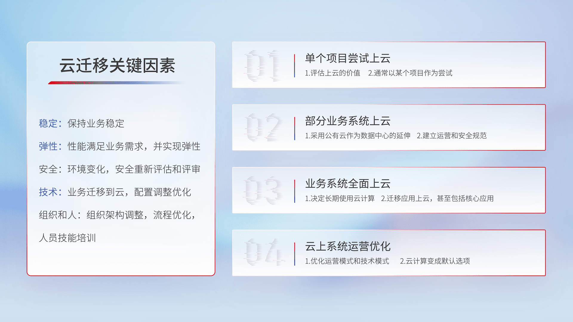 结合实际业务,,,从规划设计、、、云平台选型、、云原生改造、、数据迁移、、集成交付,,,,迁移全过程为客户识别最佳上云路径,,,,做好风险识别管理,,设计网络架构、、身份权限、、安全审计合规、、、、操作审计、、、、日志审计、、监控告警策略、、、多站点容灾设计等,,对云上基础设施进行整体规划,,,,提升IT治理水平,,,以满足弹性、、、高可用、、、高性能的需求。。。
