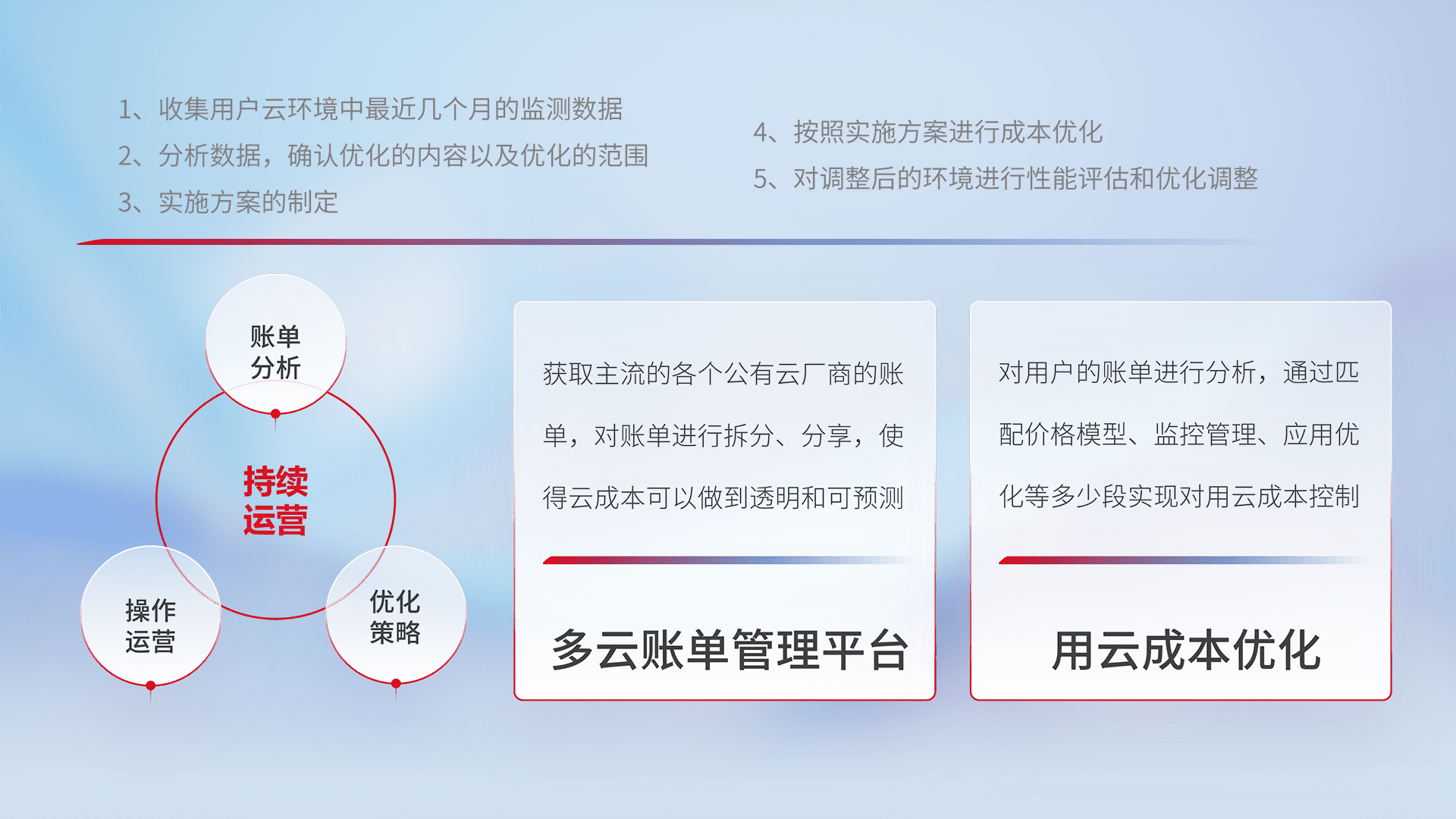 通过多云纳管,,,,以统一的资源数据模型把客户的云资源进行抽象和封装,,,进而实现对多云资源的统一操作,,,,保障云资源管理的可靠性、、、稳定性与可用性。。。。量身定制化运维内容,,配置、、、、开发运维、、、、补丁管理、、备份、、监控、、认证和访问管理、、、、审计和日常巡检等,,,保障在用云过程中的可靠度,,,稳定度以及高可用率。。